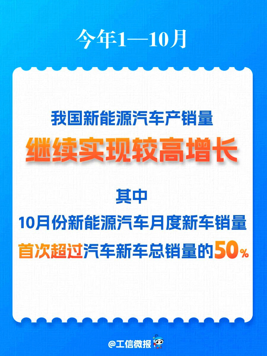 中国汽车工业协会11日发布的最新数据显示,今年1至10月份,我国新能源汽车产销量继续实现较高增长。其中,10月份新能源汽车月度新车销量首次超过了汽车新车总销量的50%。